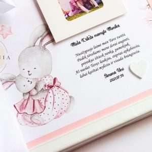 Įvairūs dizainų pasirinkimai, individualiai derinamas tekstas, galimybė atspausdinti ir įdėti vaikučio nuotrauką.