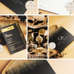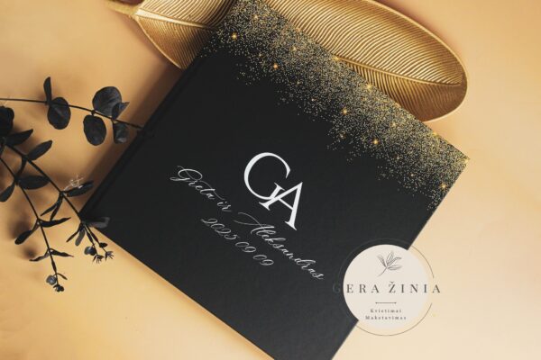 Prabangiai atrodantis dizainas su jaunųjų inicialais, vardais ir šventės data.