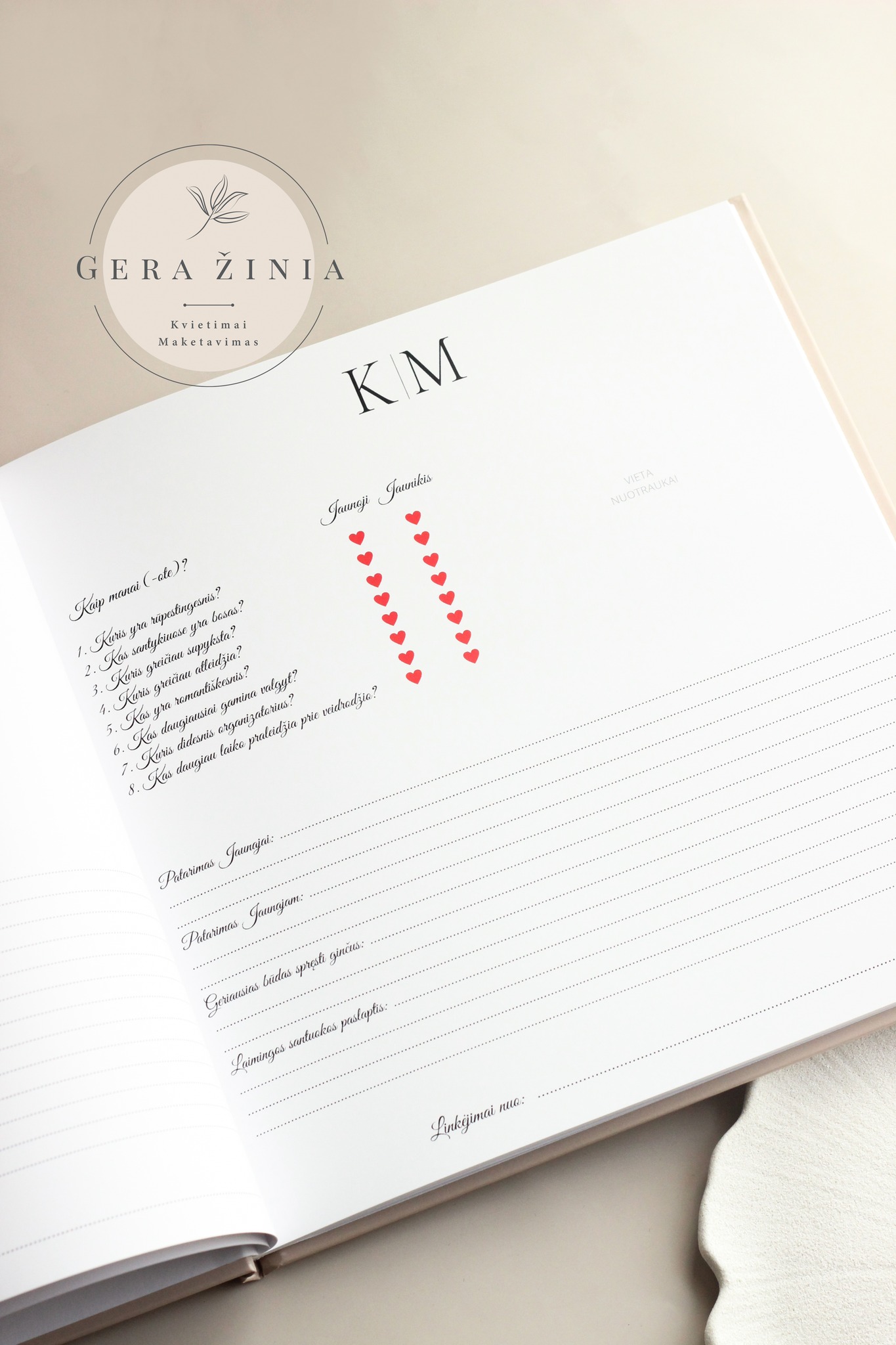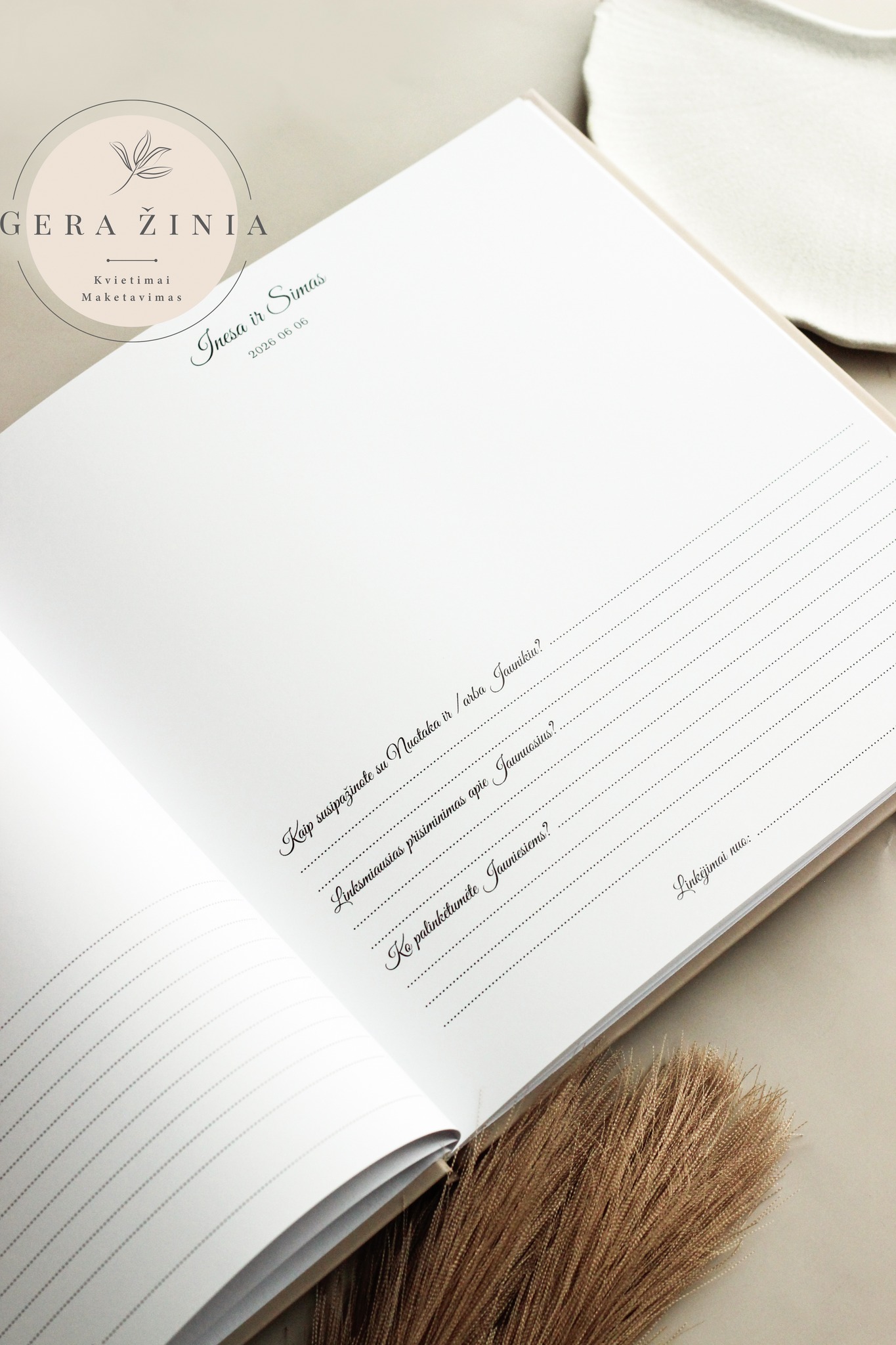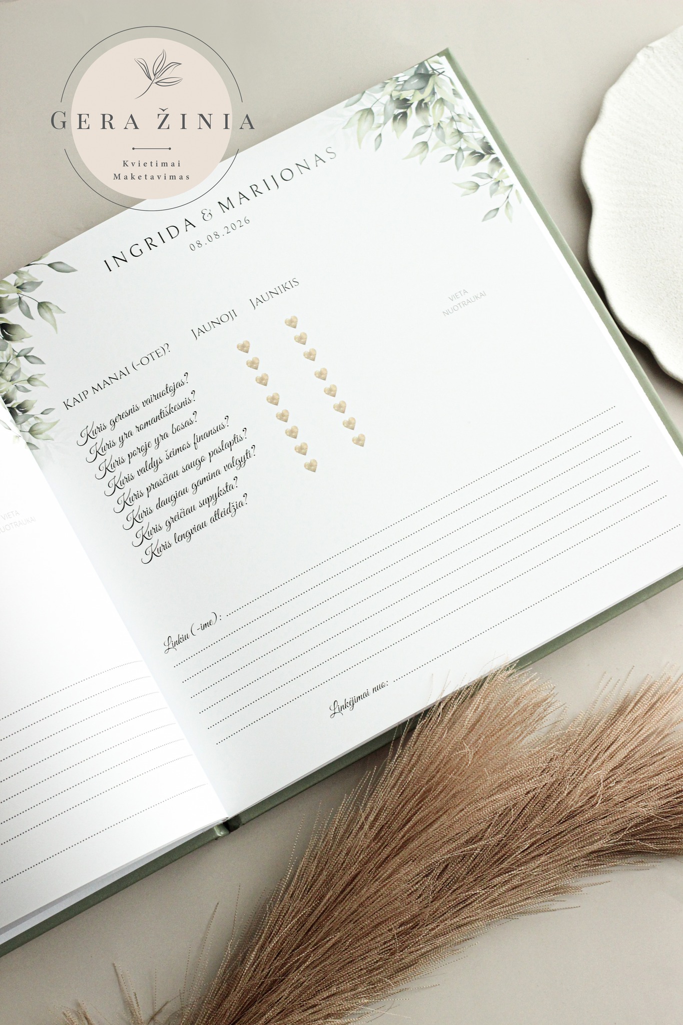 ✨ Personalizuota knygos anketa – Jūs galite pasirinkti, kokie klausimai bus užduodami svečiams, kad jų palinkėjimai būtų ne tik nuoširdūs, bet ir įdomūs.